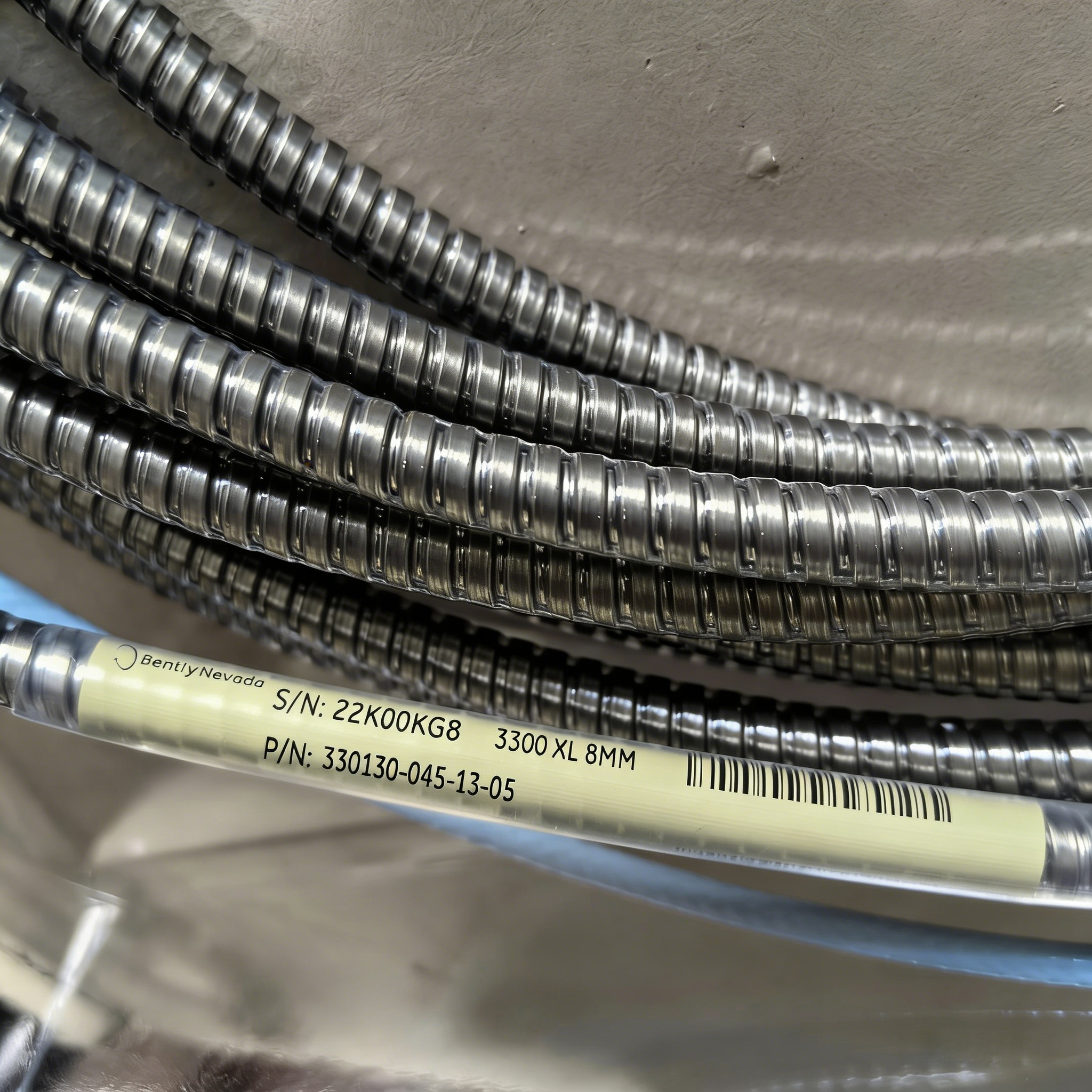 It is an essential component of the 3300 XL 8 mm eddy current probe system, designed for applications requiring the precise 4.5 meter length to match a 0.5 meter hazardous area approved probe to form a complete 5 meter intrinsically safe system, along with mechanical protection, oil leak prevention, environmental sealing, and intrinsic safety in extremely harsh industrial environments. Typical applications include turbine bearing housings, compressors, and gearboxes in Zone 0 and Zone 1 hazardous areas such as refineries, petrochemical plants, and natural gas facilities, where lubricating oil leakage risk, mechanical stress, oil mist, moisture, and intrinsic safety requirements are all present. When using a 0.5 meter hazardous area approved probe (e.g., 330101-XX-05-XX-05), a 4.5 meter hazardous area approved extension cable is required to form a complete 5 m IS system (0.5 m + 4.5 m = 5 m). This model meets this precise total length matching requirement while providing stainless steel armor, FluidLoc leak prevention, connector protectors, and hazardous area approvals – comprehensive mechanical protection, internal leak prevention, environmental sealing, and intrinsic safety for the cable and connectors in hazardous areas. It represents the ultimate protection configuration for 5 m IS systems using a 0.5 m probe.