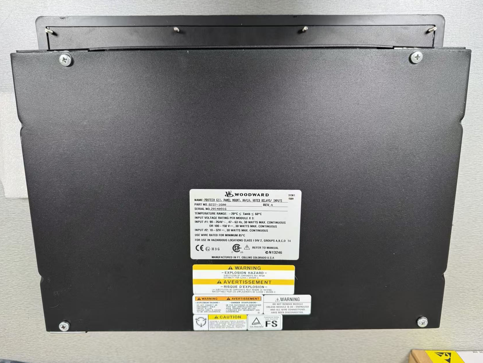 The 8237-1600 is a high‑reliability overspeed protection device from Woodward’s ProTech‑GII series. It is designed for steam turbines, gas turbines, hydro turbines, and large reciprocating engines. This model features panel mount construction, mixed high‑voltage and low‑voltage (HV/LV) power inputs, 2oo3 (two‑out‑of‑three) voted relay outputs, and voted inputs. It is a safety device certified for SIL 3 (IEC 61508) and complies with API 670, API 612, and API 611 standards.