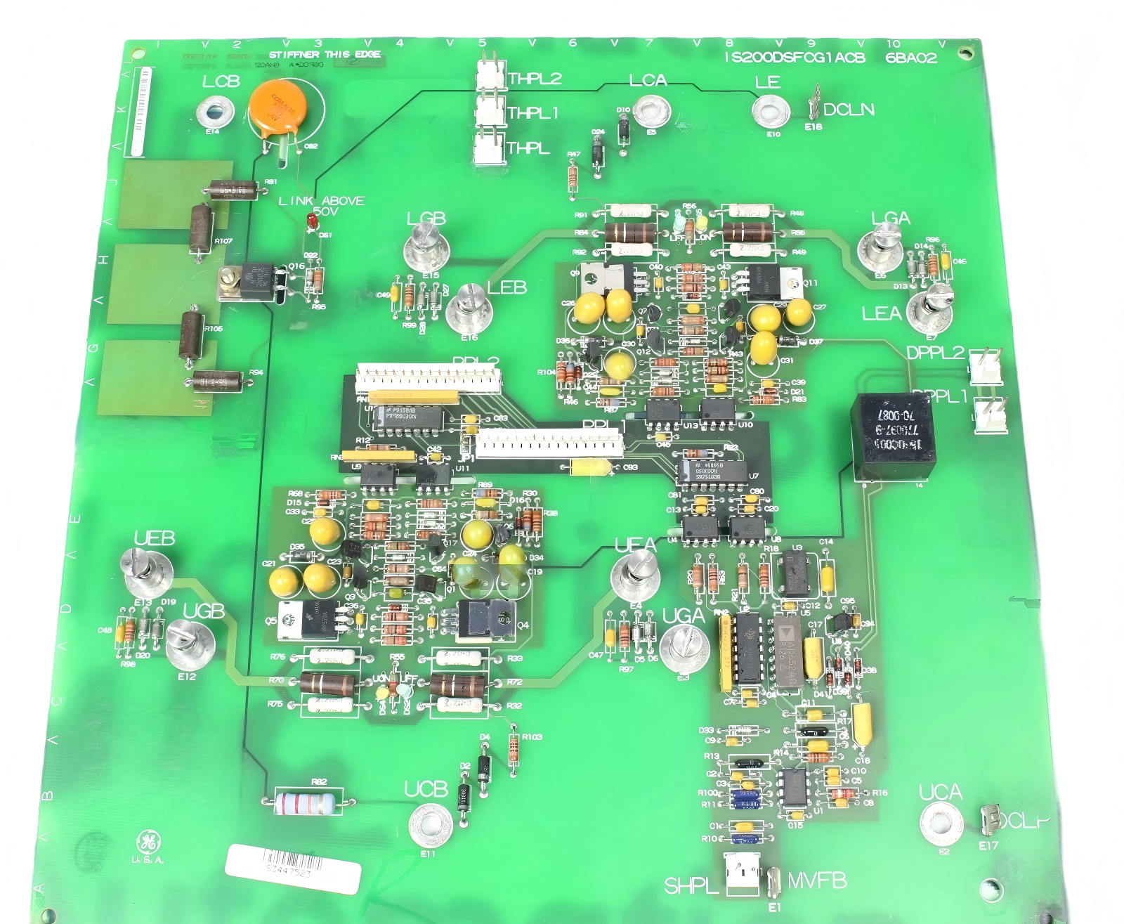This board is specifically designed for drive/source applications with 600 V LL rms AC input and supports drive systems rated for both 1000 Amp and 1800 Amp current levels. In a 1000 A system, one DSFC board is required per phase, totaling three boards. In an 1800 A system, two DSFC boards connected in a "daisy chain" configuration are required per phase, totaling six boards. The DSFCG1A interfaces with the drive control system via the IS200BPIB Drive Bridge Personality Interface Board (BPIB).