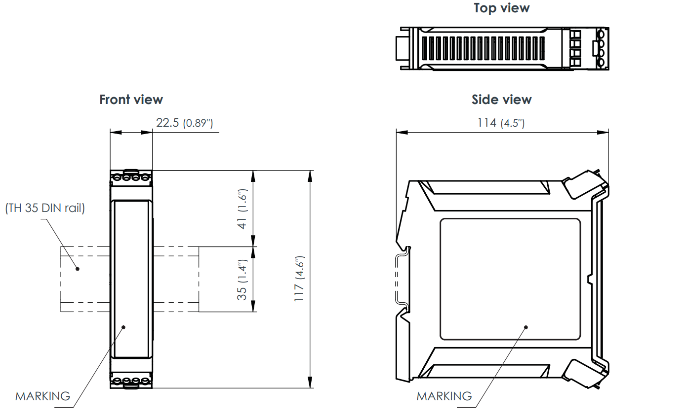 All dimensions are in mm (in) unless otherwise stated. For standard versions of the GSI127, the housing is completely grey in colour. For Ex approved versions of the GSI127, the housing is grey in colour but with a screw-terminal connector (top) for sensor-side signals (electrical connections) that is blue in colour.