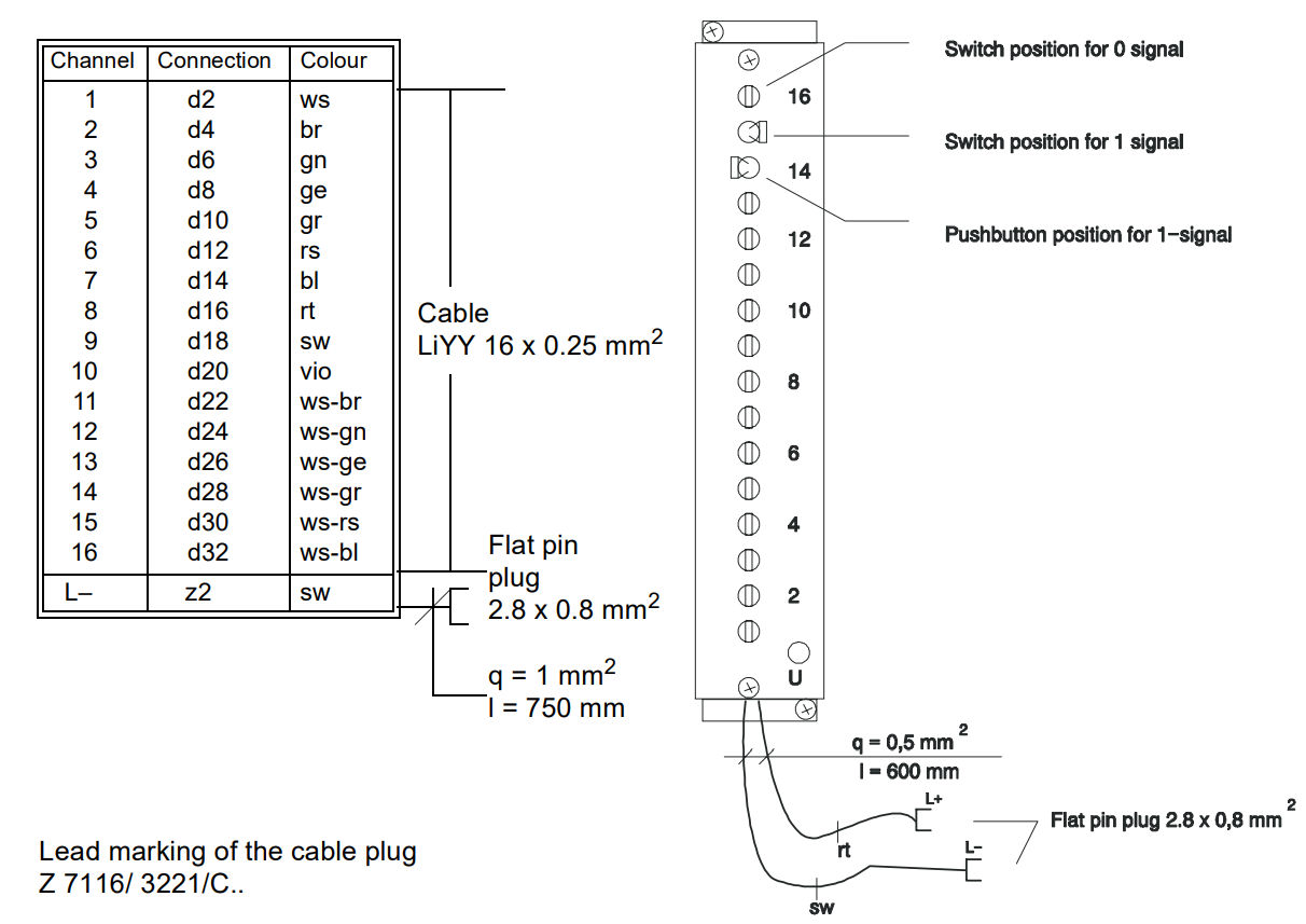 The matching Z 7116/3221 cable plug is used. Each cable contains 16 wires of 0.25 mm², corresponding to the 16 input channels and one common negative (L-). The wire color coding is as follows: